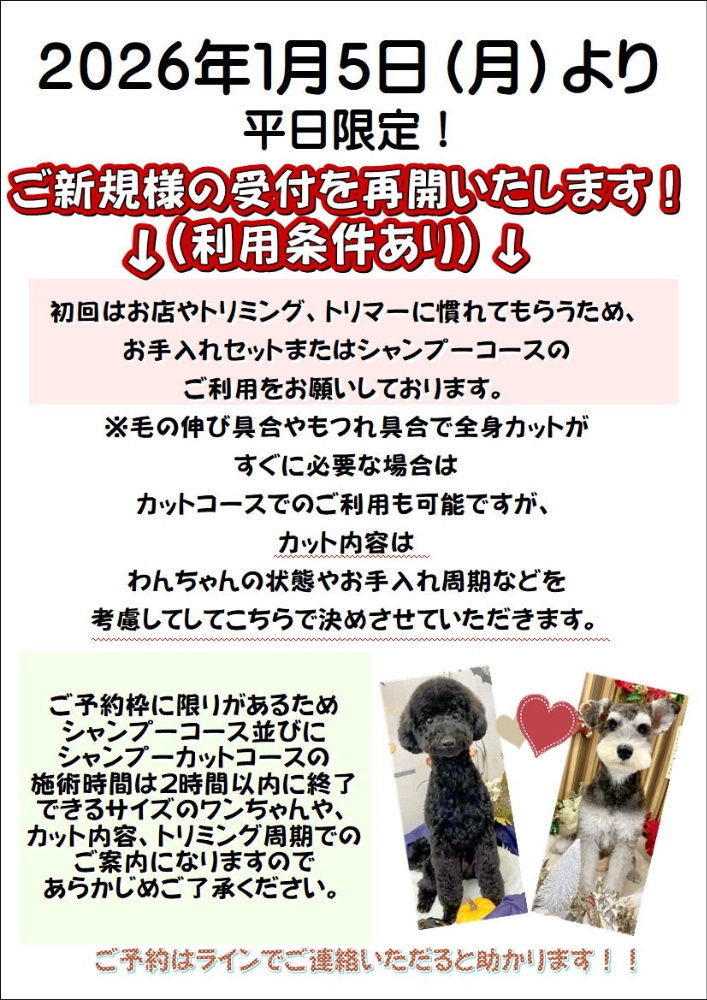 わんちゃんの種類により予約状況が空きになっていてもお受けできない場合がございます。予めご了承下さい。